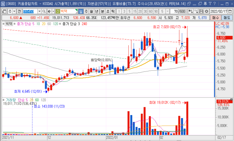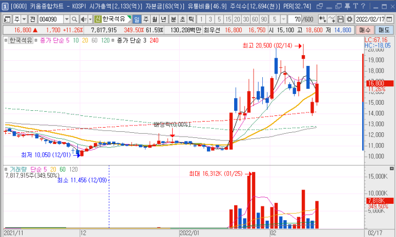 인수 이유(재료와 차트(거래량, 지평선)를 통한 이유) 13:00오버나이트 네이버에서 우크라이나 검색 결과 친러 반군이 장악한 루간스크에 포격을 가했다는 소식이 있었다.그래서 급히 실시간 종목 조회 순위를 보니 지에스 미래생명자원 빅텍 중앙나비스 대성에너지 한국석유 등이 올라 있어 급히 사들일 종목을 찾던 중 그대로 아무 종목이나 사들였다.